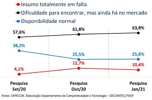 • Na pesquisa de jan/21, manteve-se a percepção de out/20, de que ainda há dificuldades para acessar insumos no mercado.