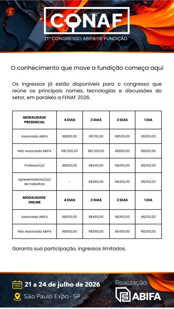 Realizado bienalmente, paralelamente à FENAF – Feira Latino-Americana de Fundição, o CONAF é promovido pela ABIFA e consolidou-se como um dos principais encontros técnicos e estratégicos do setor.